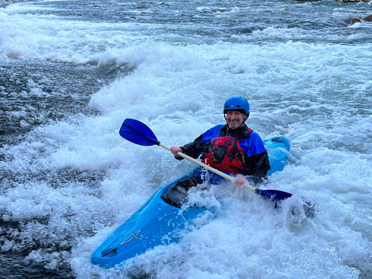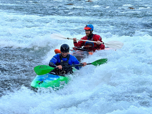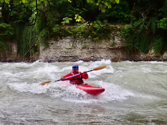 paar Zwischenstopps im Kehrwasser und diversen Wellen und Walzen wurde das Wasser ruhiger. Auf der linken Seite stieg eine Felswand empor und wir fuhren unter etlichen Brücken hindurch.