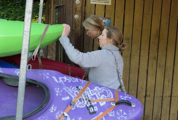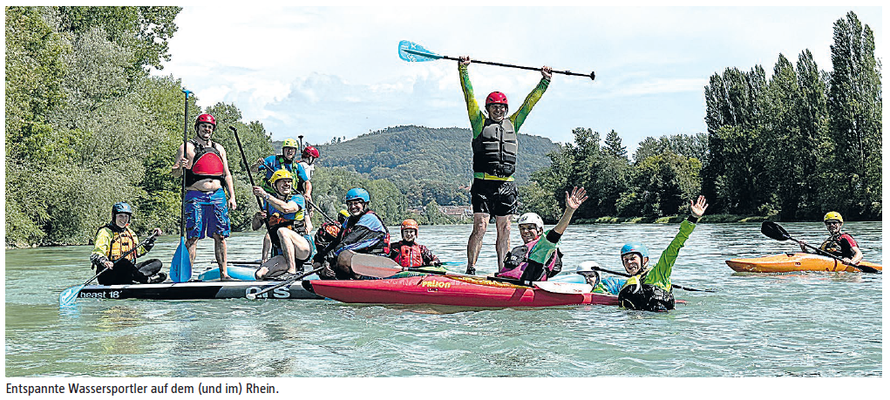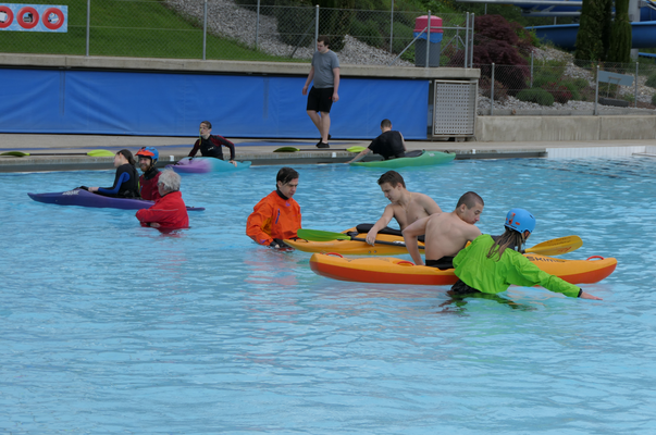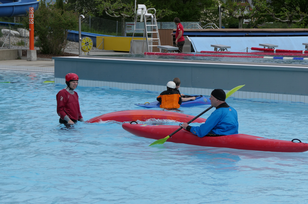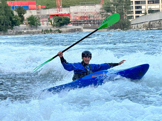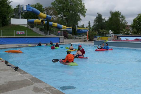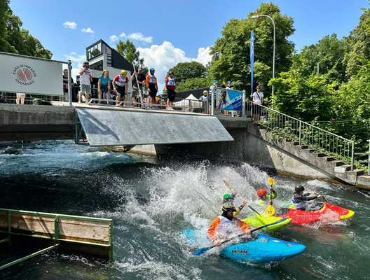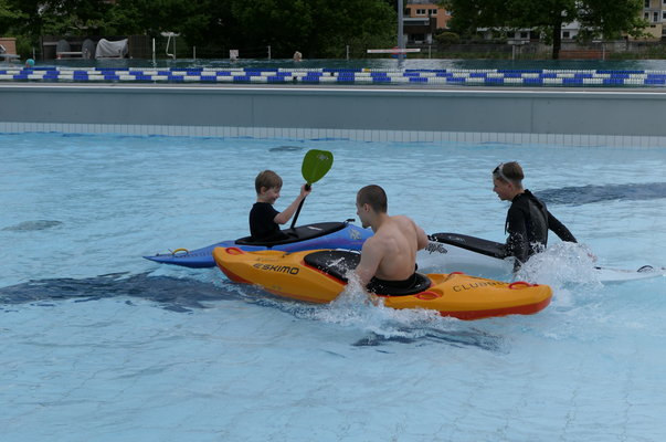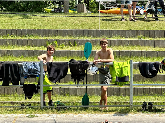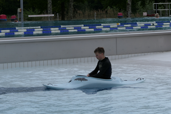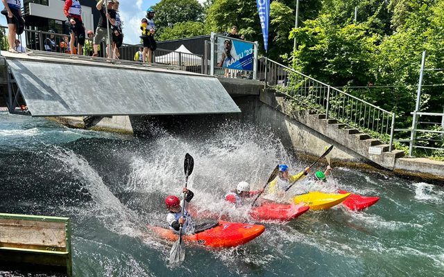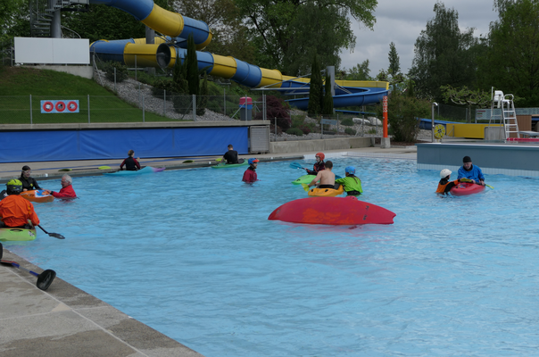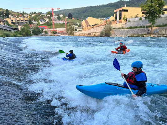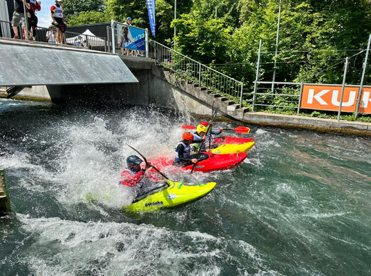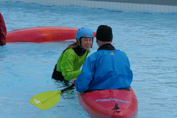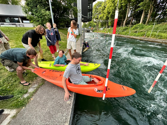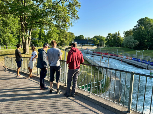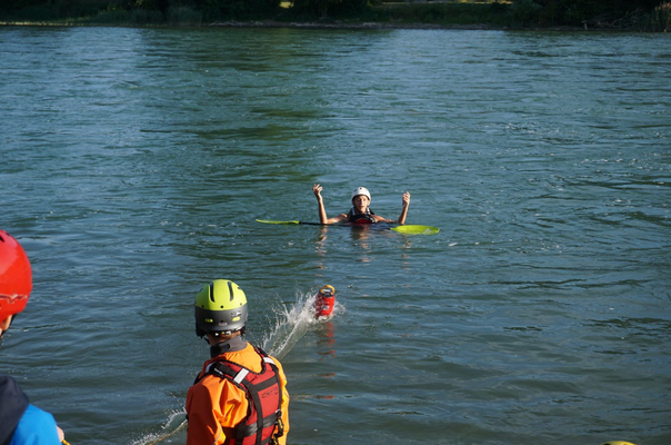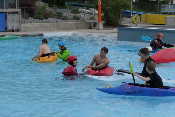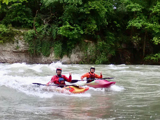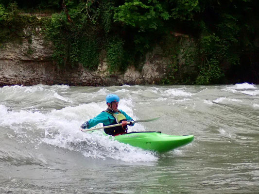 unter die Welle und schauten sie uns auf einer Plattform an. Jemand blieb unten und machte Videos und Fotos. Alle andern fuhren souverän runter, nur eine Kanutin musste gerettet werden. Nach ein