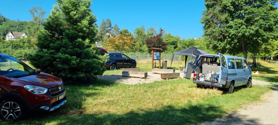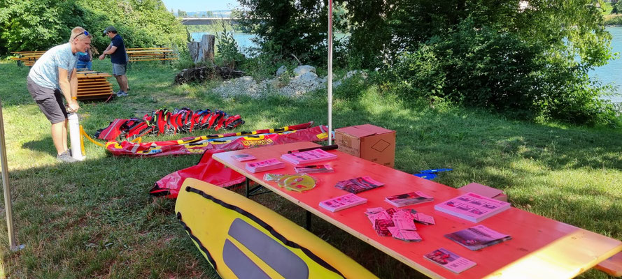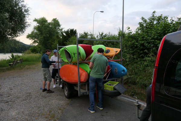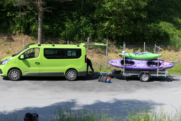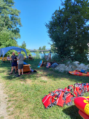 vorher aussteigen. Mühsam beförderten wir die Boote den Hang hinauf und auf der andern Seite wieder hinunter. Wir zogen uns schnell um und holten den Anhänger mit unserem Essen. Bald waren wir