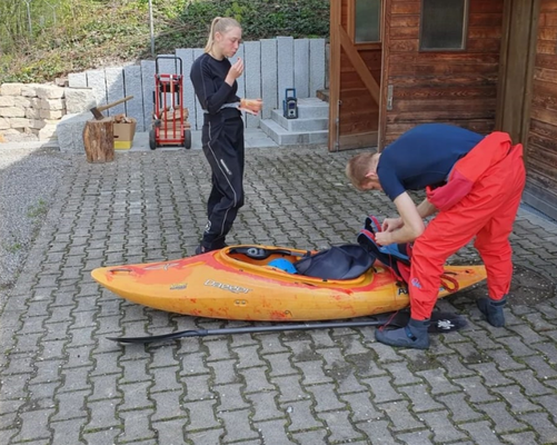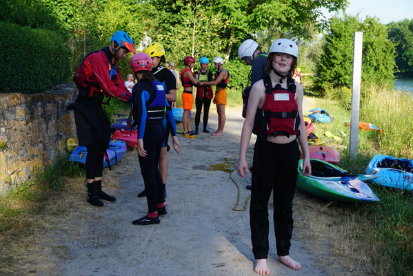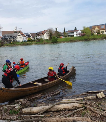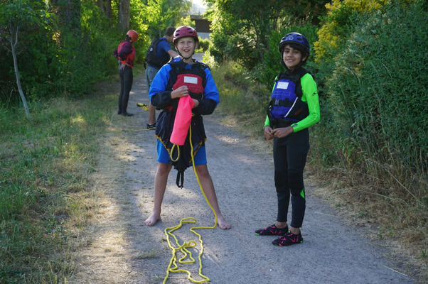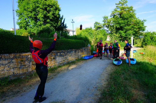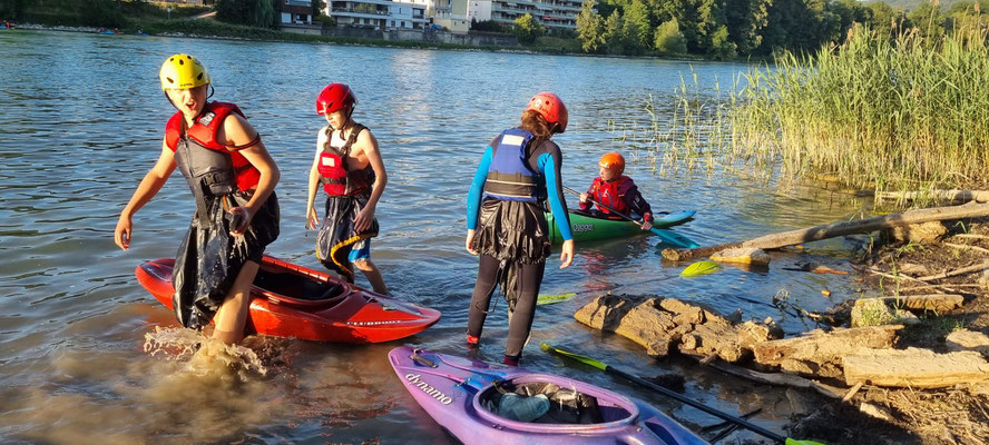 wir endlich losfahren konnten. David und Nadine waren mit einem Zweier-Kayak unterwegs und sonst alle andern einzeln. Vor dem Wehr stiegen wir aus und liefen über Steine und an Dornen vorbei
