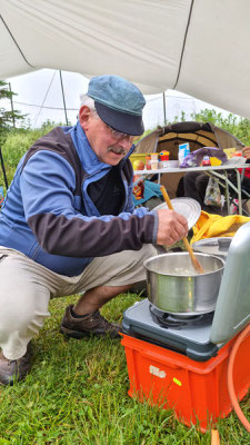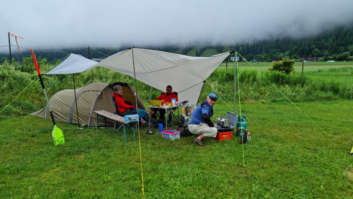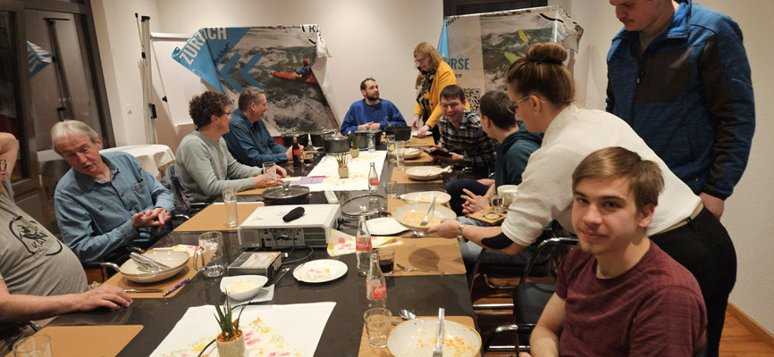 Samstagmorgen: Irgendwo zwischen Vorfreude und Thermoskanne. Nach der Autofahrt und einer kurzen Bahnfahrt mit Boot kamen wir an der Rheinschlucht an. Eigentlich war „gemütliches“ Einpaddeln angesagt. Doch der Fluss hatte sich nach dem Regen offenbar für den Extremmodus entschieden und es donnerten 200 m³/s durchs Tal. Somit wurde aus „Einpaddeln light“ kurzerhand „Achterbahn mit Helm“. Wer bis dahin noch nicht richtig wach war, wurde spätestens beim ersten Kehrwasser schlagartig auf Betriebstemperatur gebracht. Abends auf dem Campingplatz war dann Schicht im Schacht – zumindest auf dem Wasser. Denn eine gefühltes 3-gänge-Menü durfte nicht fehlen.