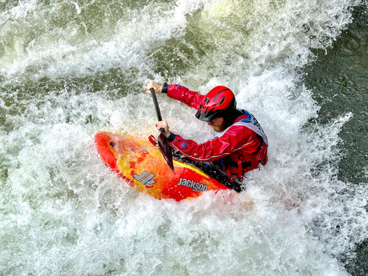 Wir besprachen gemeinsam die Linie und unsere Route durchs Hindernis, dann ging’s einer nach dem anderen los – unter den wachsamen Augen der Gruppe. Ich folgte Markus, der mir den einfachsten Weg zeigte. Der wichtigste Tipp, den ich hörte: „Immer weiter paddeln – nicht aufhören!“ Und ehe ich richtig realisierte, was gerade geschah, war ich bereits auf ruhigerem Wasser angekommen.