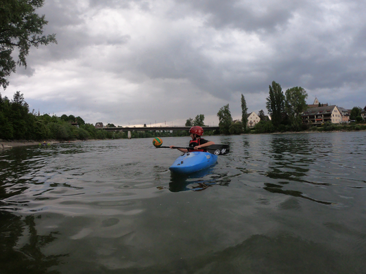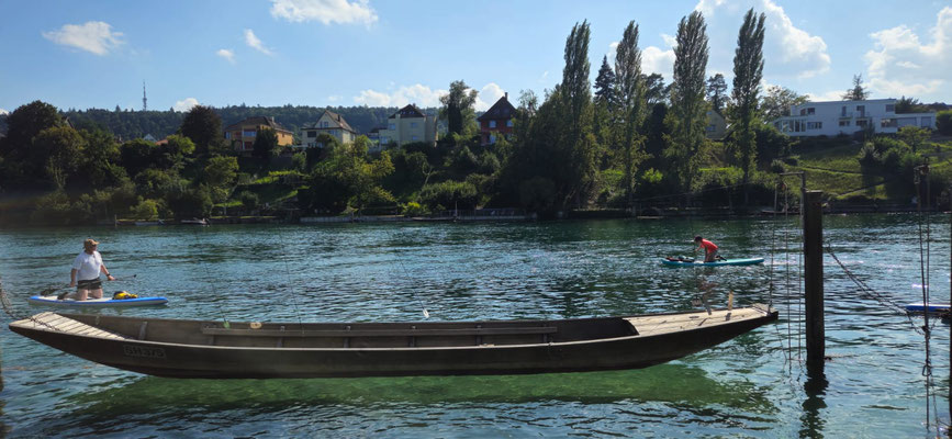 10:55 Uhr: Leinen los, Paddel rein. Bei gemütlichen 392 Kubik Wasserfluss, angenehm warm, gut besucht, aber nicht überfüllt, ließen wir uns den Rhein hinuntertreiben.