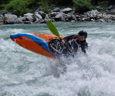 Das Wetter war bewölkt, und die kühle Bergluft zusammen mit dem Gletscherwasser, das unter uns floss, war im Wind deutlich zu spüren. Seltsamerweise kam mir dabei nie der Gedanke, dass ich in dieses Wasser fallen könnte. Wir stiegen in unsere Kajaks und paddelten los – mitten hinein ins weisse Spritzwasser und Schaum. Nach etwa 10–15 Minuten legten wir unsere Boote wieder ans Ufer, um das erste grössere Hindernis anzugehen: eine Walze mit einem Teppich aus Weiss. David meinte nur: „So viel Wasser habe ich hier noch nie gesehen.“